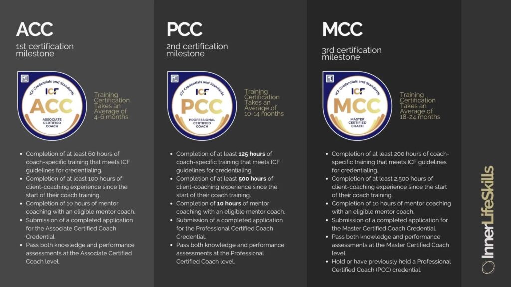 Si bien los detalles numéricos específicos de los requisitos para la certificación ACC no fueron proporcionados en la información original, es fundamental entender que, al ser el primer nivel profesional de la ICF, sus estándares son rigurosos pero más accesibles en comparación con los niveles superiores, como el Professional Certified Coach (PCC) y el Master Certified Coach (MCC). La información proporcionada nos indica que los estándares de un coach MCC son mucho más altos que los de ACC y PCC.