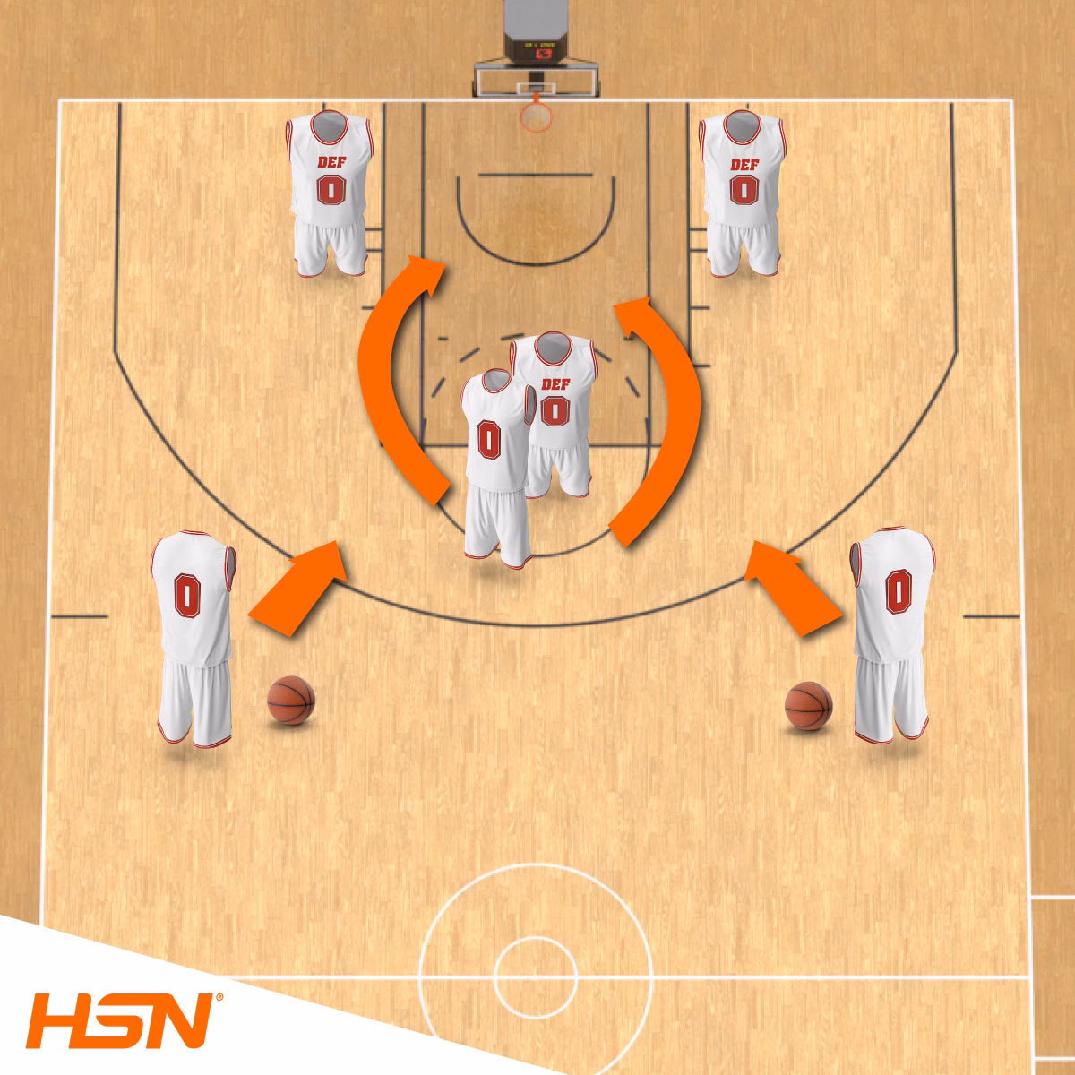 - Una vez que el pívot recibe el balón, debe intentar anotar una canasta. Los otros dos defensores pueden (y deben) cerrar la acción de entrada a canasta, asistiendo la defensa. Es importante que solo el defensor asociado al jugador con balón pueda presionar directamente el balón.
