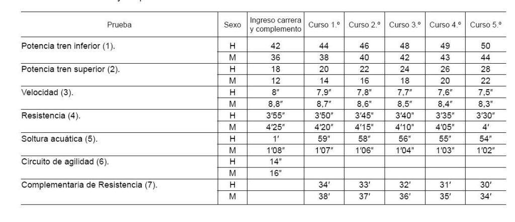 Según el Artículo 3 de esta Orden, las pruebas físicas deben evaluar como mínimo la fuerza, la resistencia y, para edades inferiores a cuarenta y cinco años, la velocidad. Para obtener la declaración de aptitud general, se requiere alcanzar un mínimo de 20 puntos en cada prueba, de acuerdo con las tablas de puntuación por marcas, sexo y edades que se recogen en el Anexo II de la OM. Aunque estas tablas no se detallan aquí, la orden subraya la importancia de un rendimiento equilibrado en todas las áreas.