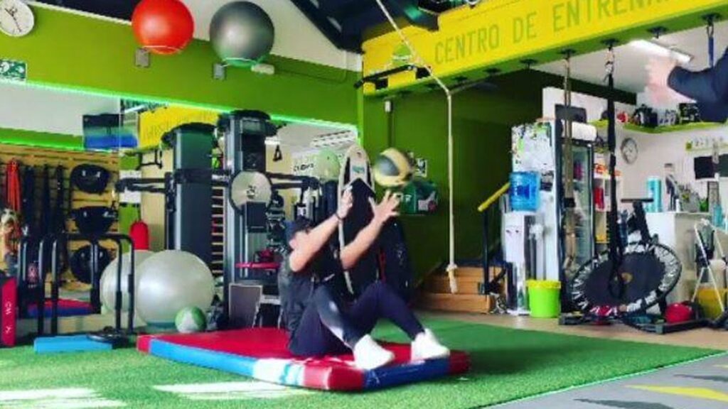 Un ejemplo claro es su rutina de abdominales. Después de una serie de flexiones, David Bustamante realiza abdominales mientras interactúa con un balón medicinal. Tumbado en el suelo, recibe el balón de su entrenador, lo lanza de vuelta mientras eleva el tronco y lo vuelve a recibir al descender. Esta variación añade varias capas de dificultad: