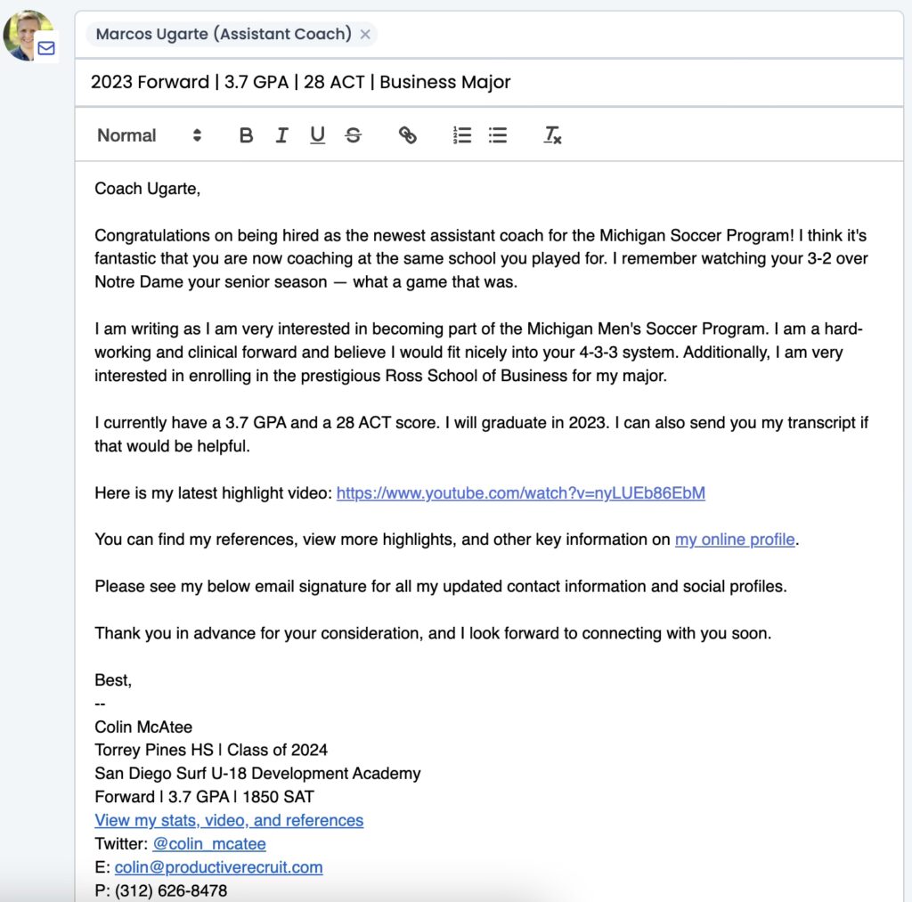 Cada correo que envíes debe estar dirigido específicamente al entrenador o entrenadores de ese programa. Evita saludos genéricos como «A quien corresponda» o «Estimado entrenador». En su lugar, utiliza el apellido del entrenador, por ejemplo, «Estimado Coach Smith». Si vas a enviar el mismo correo a varios miembros del cuerpo técnico, asegúrate de dirigirte a todos ellos individualmente: «Estimado Coach Smith, Coach Jones, Coach White».