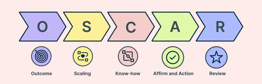 - Mezcla Sin Problemas: No necesitas revisar todo tu enfoque. En cambio, piensa en OSCAR como una herramienta adicional en tu arsenal. Por ejemplo, si estás utilizando el modelo GROW, puedes entrelazarlo enfatizando el paso de 'Resultado' de OSCAR para dar una mayor dirección al 'Goal' de GROW.