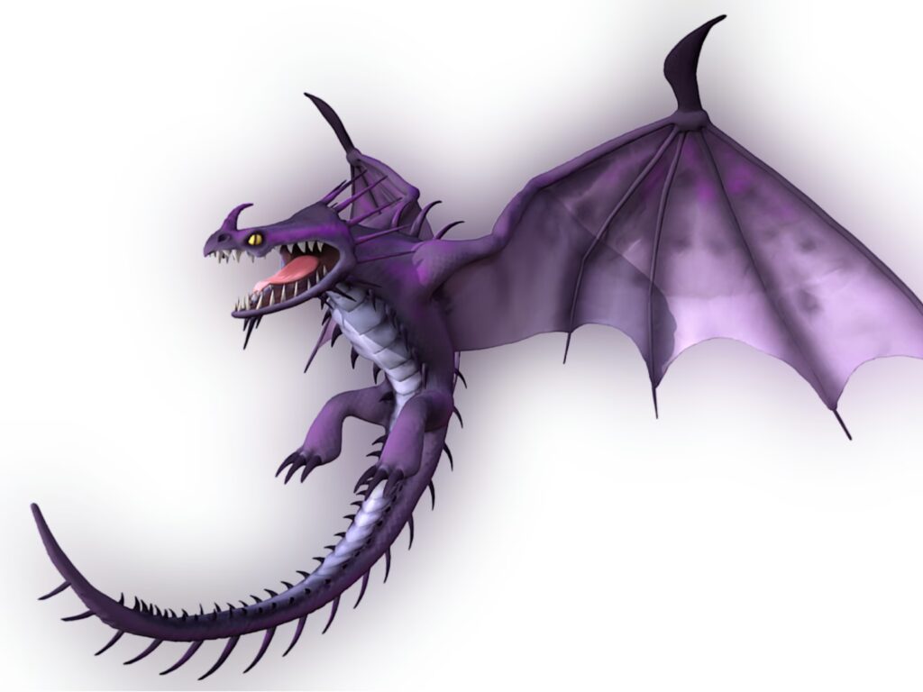 Sus alas son de proporciones generosas, equipadas con una garra en cada una que le permite una locomoción terrestre similar a la de los antiguos pterosaurios. A lo largo de su espalda y hasta su cola, posee una serie de espinas metálicas que no solo le confieren una apariencia formidable, sino que son cruciales para sus habilidades eléctricas. En su cabeza, una cresta violeta, más fina y corta que la del Nadder, añade a su distintiva silueta. Sus ojos, situados curiosamente en la punta de su hocico y muy cerca de sus pequeñas fosas nasales, le otorgan una visión singular. La boca del Skrill es un detalle impactante, similar a la de un cocodrilo, con dientes pequeños pero extremadamente finos y afilados, perfectos para su dieta y estilo de combate.