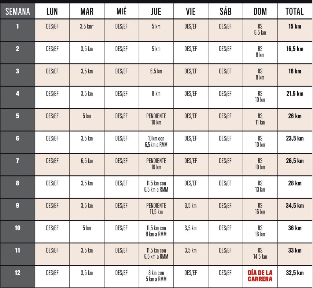 - Se aconseja reducir el kilometraje total semanal en un 50% aproximadamente en comparación con tu volumen habitual en el pico de tu preparación.