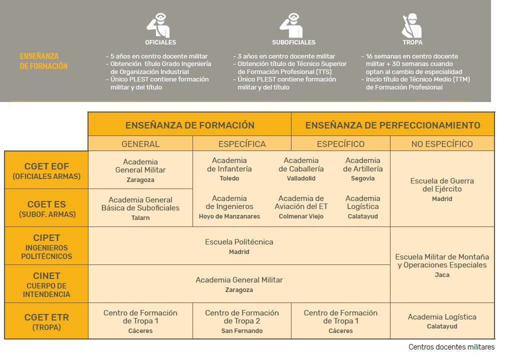 Una vez superado el proceso de selección y tras la incorporación a los centros de formación, los aspirantes son nombrados alumnos. Adquieren la condición militar y se someten a la normativa castrense. La enseñanza se divide en un periodo de acogida y adaptación (dos semanas), una fase de formación militar general (ocho semanas) y una fase de Formación militar específica y de especialidad fundamental (entre cuatro y treinta semanas, según la plaza). Al superar estas fases y firmar el compromiso, adquieren el empleo de Soldado o Marinero.