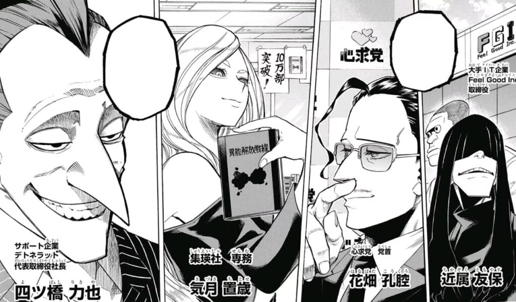 | Liderazgo | Destro (fundador), Re-Destro (actual). Líderes son empresarios exitosos con vasta riqueza y recursos. | All For One (mentor), Tomura Shigaraki (líder). Compuesto por criminales y marginados sociales. |