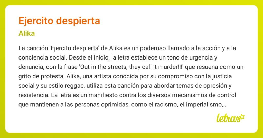 El concepto de 'despertar' adquiere una resonancia colectiva y poderosa cuando se aplica al ámbito social y político. La canción 'Ejército Despierta', cuyas letras nos han sido proporcionadas, es un claro ejemplo de este llamado a la conciencia social. No se trata de un ejército militar, sino de una 'nueva alianza' de la población que se alza contra 'mecanismos de control' que oprimen y causan dolor. La canción nombra explícitamente el racismo, el imperialismo, el capitalismo, el colonialismo, el fascismo y las jerarquías, denunciándolos como formas de 'Babilón'.