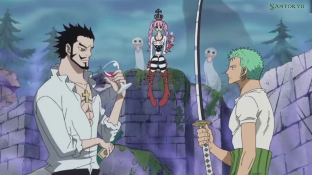 La confianza de Roronoa Zoro era tan afilada como sus katanas cuando se encontró con Mihawk. Había derrotado a innumerables oponentes, superado desafíos y forjado una reputación formidable como el cazador de piratas. Sin embargo, la presencia de Mihawk era diferente. Una aura de poder inmensurable emanaba de él, una calma que solo poseen aquellos que han alcanzado la cima. A pesar de esto, la ambición de Zoro era más fuerte que cualquier temor, y sin dudarlo, lanzó su desafío.