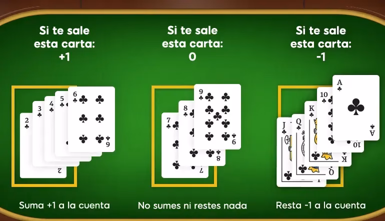 Está matemáticamente demostrado que las cartas de mayor valor (dieces, figuras y ases) benefician más al jugador, mientras que las cartas de menor valor (del 2 al 6) benefician más a la banca. Las cartas intermedias (sietes, ochos y nueves) son consideradas neutrales. Un conteo positivo indica que quedan más cartas altas en el mazo, lo que aumenta tus probabilidades de conseguir un blackjack, de que la banca se pase (ya que está obligada a pedir con 16 o menos) y de recibir manos fuertes. Un conteo negativo, por el contrario, sugiere que el mazo restante tiene una mayor concentración de cartas bajas, favoreciendo a la banca.