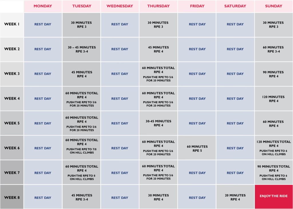 Un buen comienzo es pedalear entre treinta y sesenta minutos de dos a cuatro días a la semana. Esta fase inicial de puesta a punto varía en función de tu condición física de partida, pero suele oscilar entre las 4 y las seis semanas de entrenamiento. El objetivo es acostumbrar tu cuerpo al esfuerzo y al pedaleo, construyendo una base aeróbica sólida.
