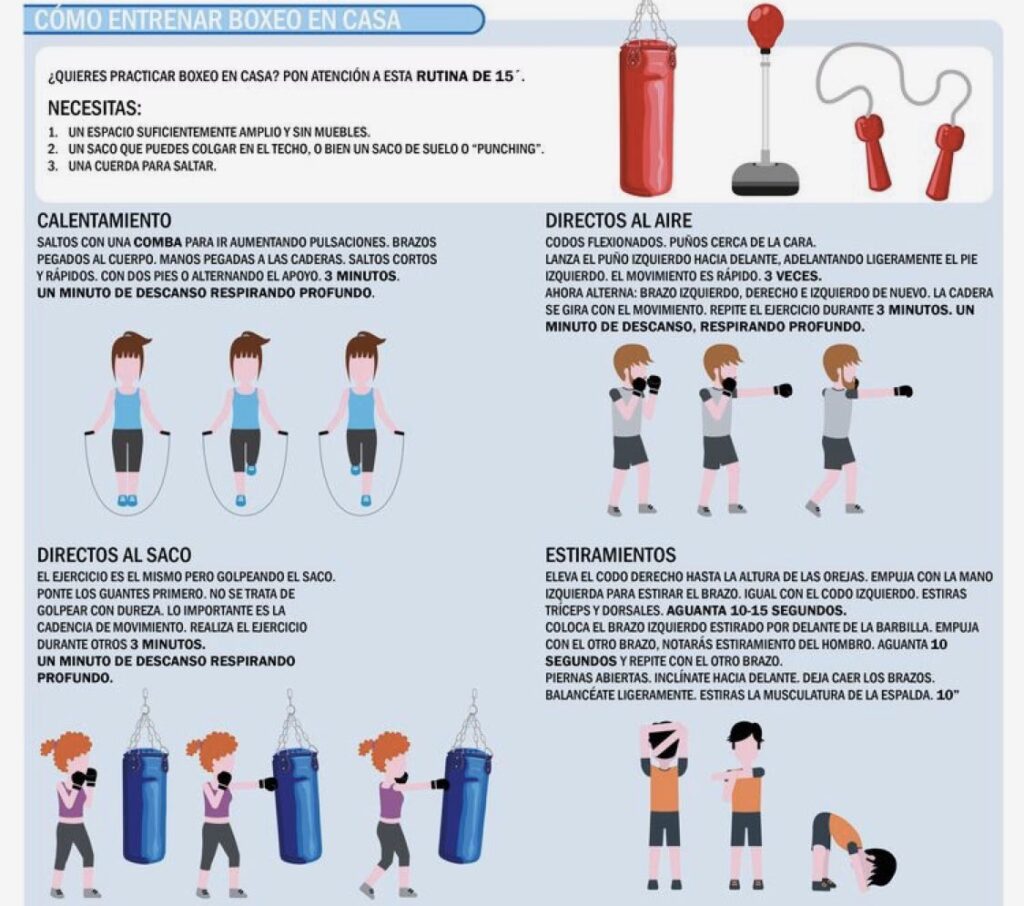 - Rodillazos y Codazos (si aplica): Ideales para trabajar el core y aumentar la potencia de golpe. Lanza rodillazos alternando las piernas durante 2 minutos, descansa y repite.
