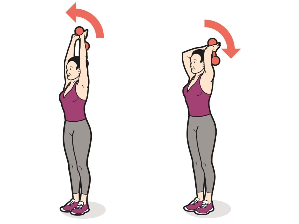 - Ejecución: Flexiona lentamente los codos, llevando los antebrazos hacia atrás, de modo que las mancuernas queden lo más cerca posible del suelo una vez que hayan sobrepasado tu cabeza. Mantén los codos relativamente fijos, apuntando hacia adelante.