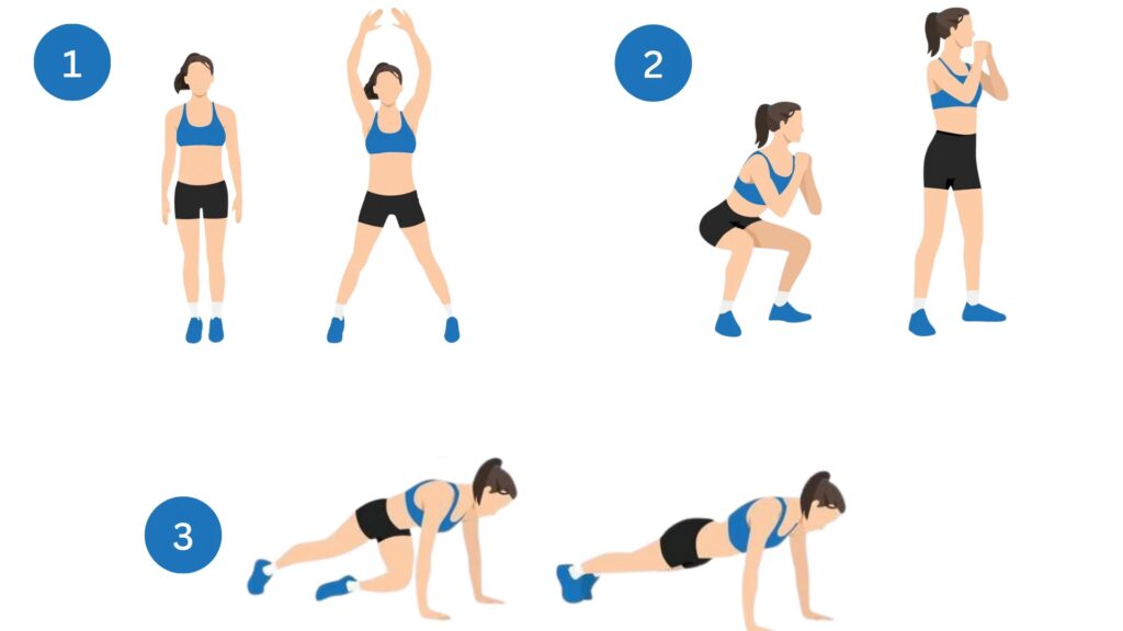 Realiza cada ejercicio durante 30 segundos, seguido de 30 segundos de descanso. Repite el circuito 3 veces.