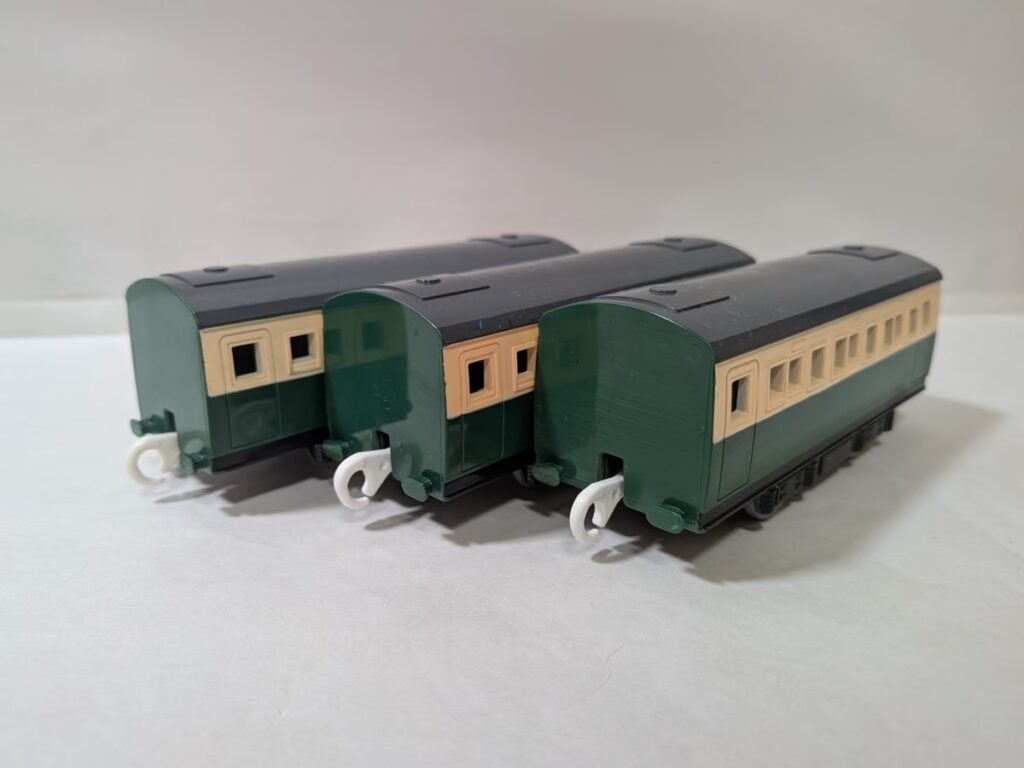 In Thomas & Friends, the Red Express Coaches are generally used for other fast trains, but occasionally used for the Express. The models of these coaches in the show were based on the Southern Railway Maunsell coaches without corridors.