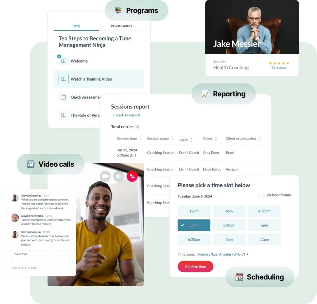 - Características: Emparejamiento automático con clientes, establece tu propio horario de coaching, cursos y eventos para mejorar tus habilidades de coaching.