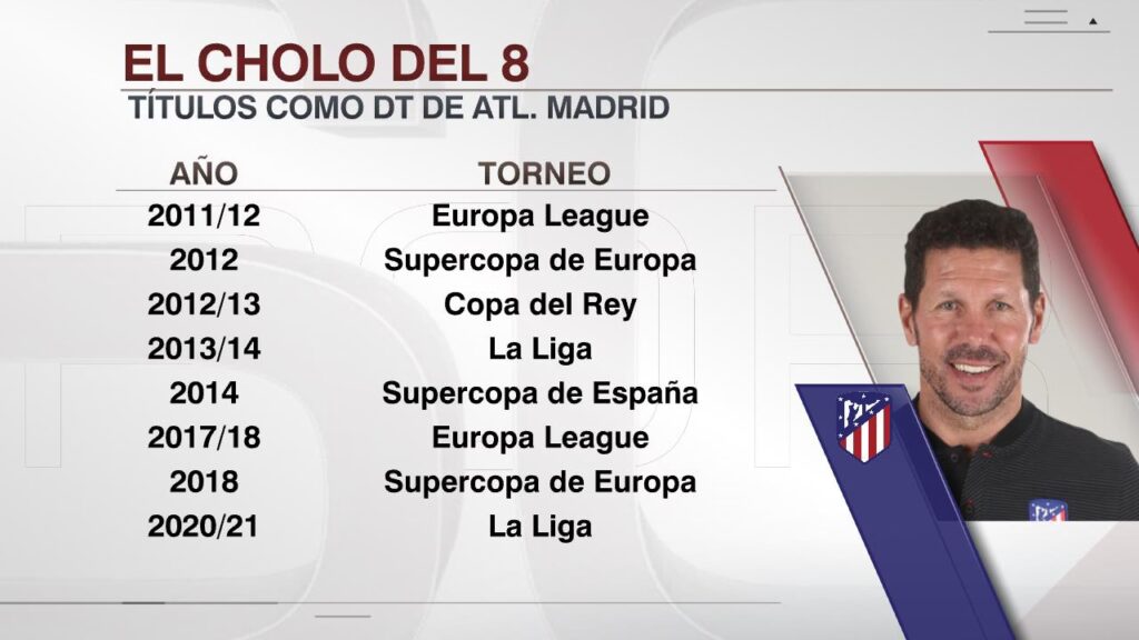 En sus más de 10 años al mando, el Cholo ha cosechado un impresionante total de ocho títulos, demostrando una consistencia y una capacidad de adaptación envidiables. Este es su palmarés: